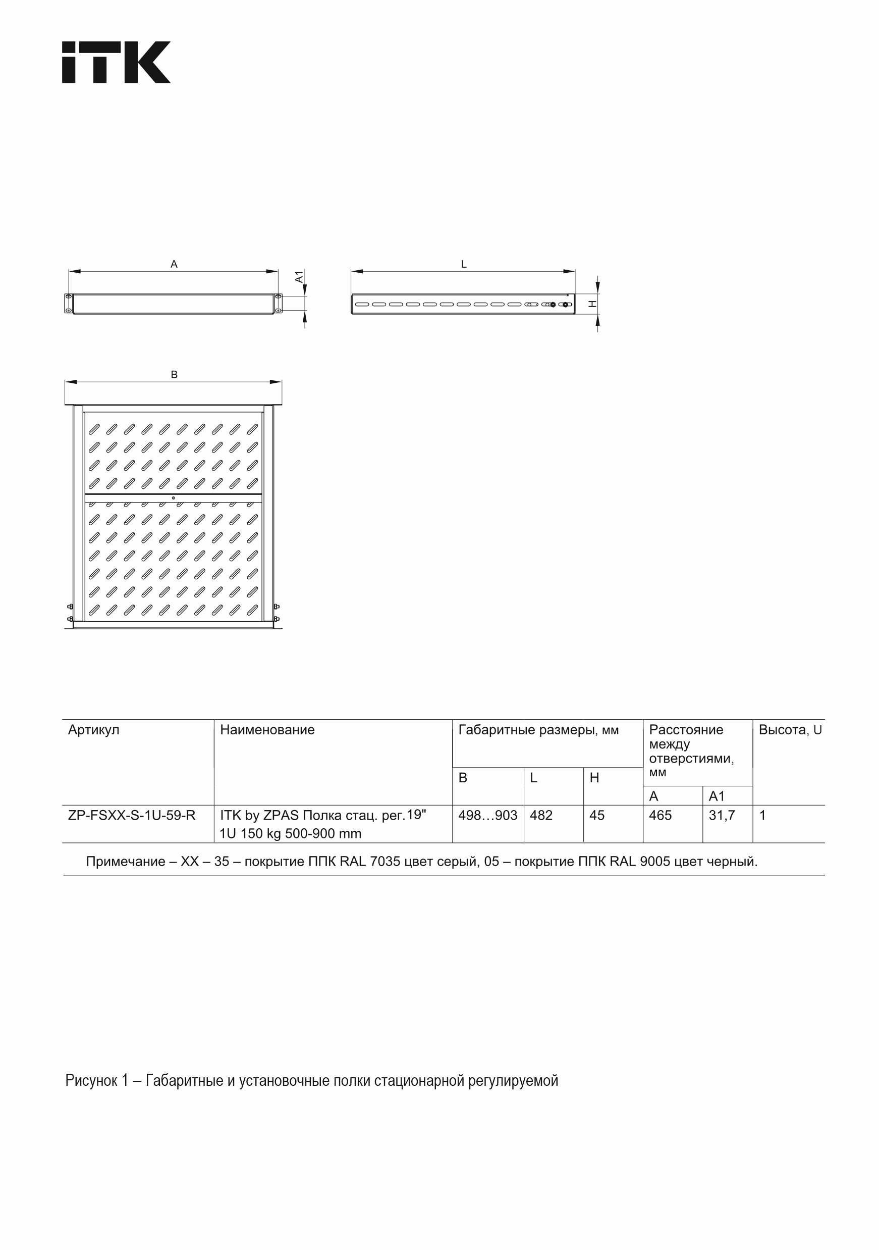 Полка стационарная, регулируемая, устанавливается на 19-ти дюймовые монтажные профили с фронтальной стороны и имеет 8 точек крепления. Предназначена для размещения телекоммуникационного оборудования массой не более 150кг, может быть установлена в диапазоне глубины от 500 до 900мм. Полка имеет высоту 1U, регулировка глубины осуществляется с шагом 25мм.